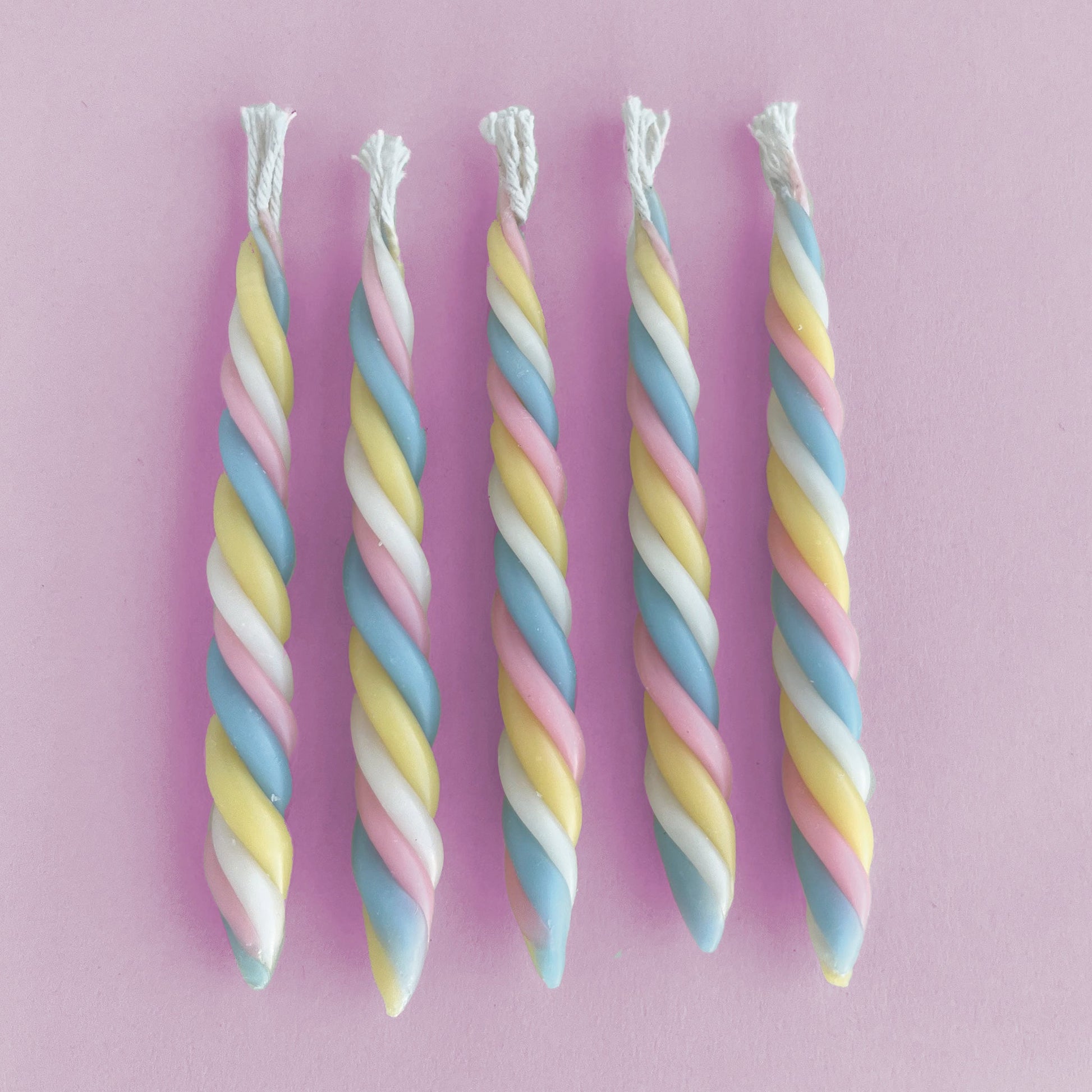 NOTES: These uniquely adorable candles are the perfect companion to your candle holder cake topper friends! They each have a twisted multicolor design in gues of pink, blue, cream, and yellow and will fit inside the brass rings of all of our featured holders!