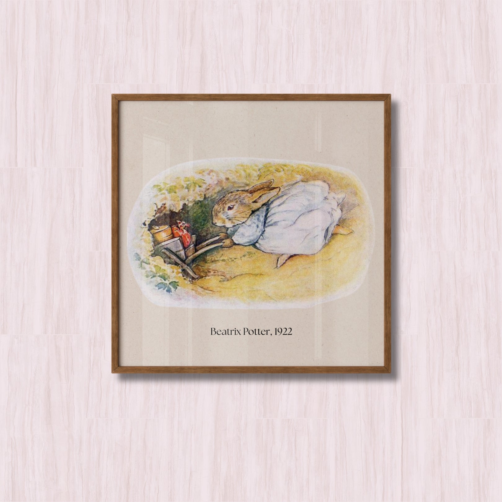 NOTES: A most precious focal point of decor for your child's space comes this exclusive Bloom & Wonder piece, featuring framed-and-updated illustration from the early 1900's by Beatrix Potter, the beloved children's book author famously known for "The Tale of Peter Rabbit" and her other published works. Potter (true name, Helen Heelis) was a pioneer of character merchandising, particularly having to do with animals. This illustration of Ms. Rabbit entering her burrow comes from "Cecily Parsley's Nursery Rhymes", published in 1922.