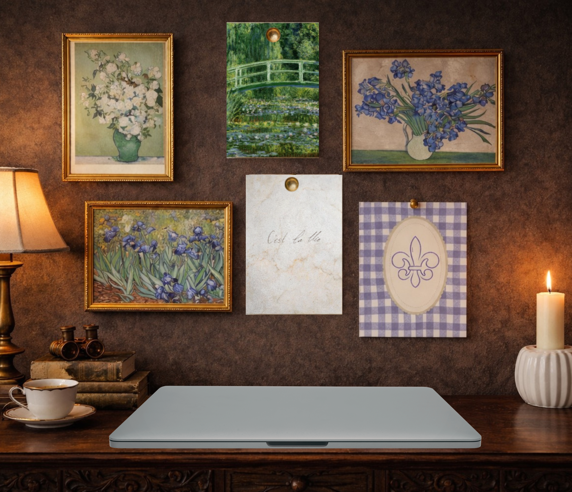 The set features iconic art, such as Van Gogh's famous Irises and Roses, inspiring "C'est La Vie" French script text, a dreamy color palette - producing the overall feeling of the French countryside.
