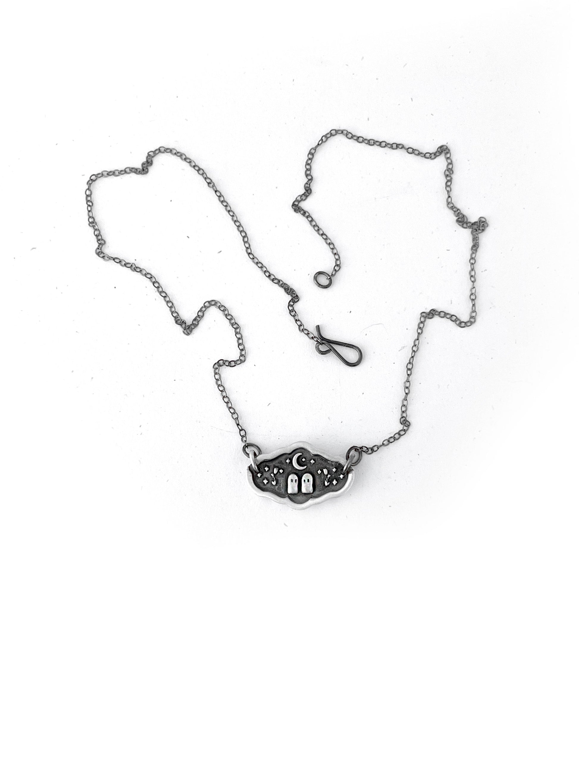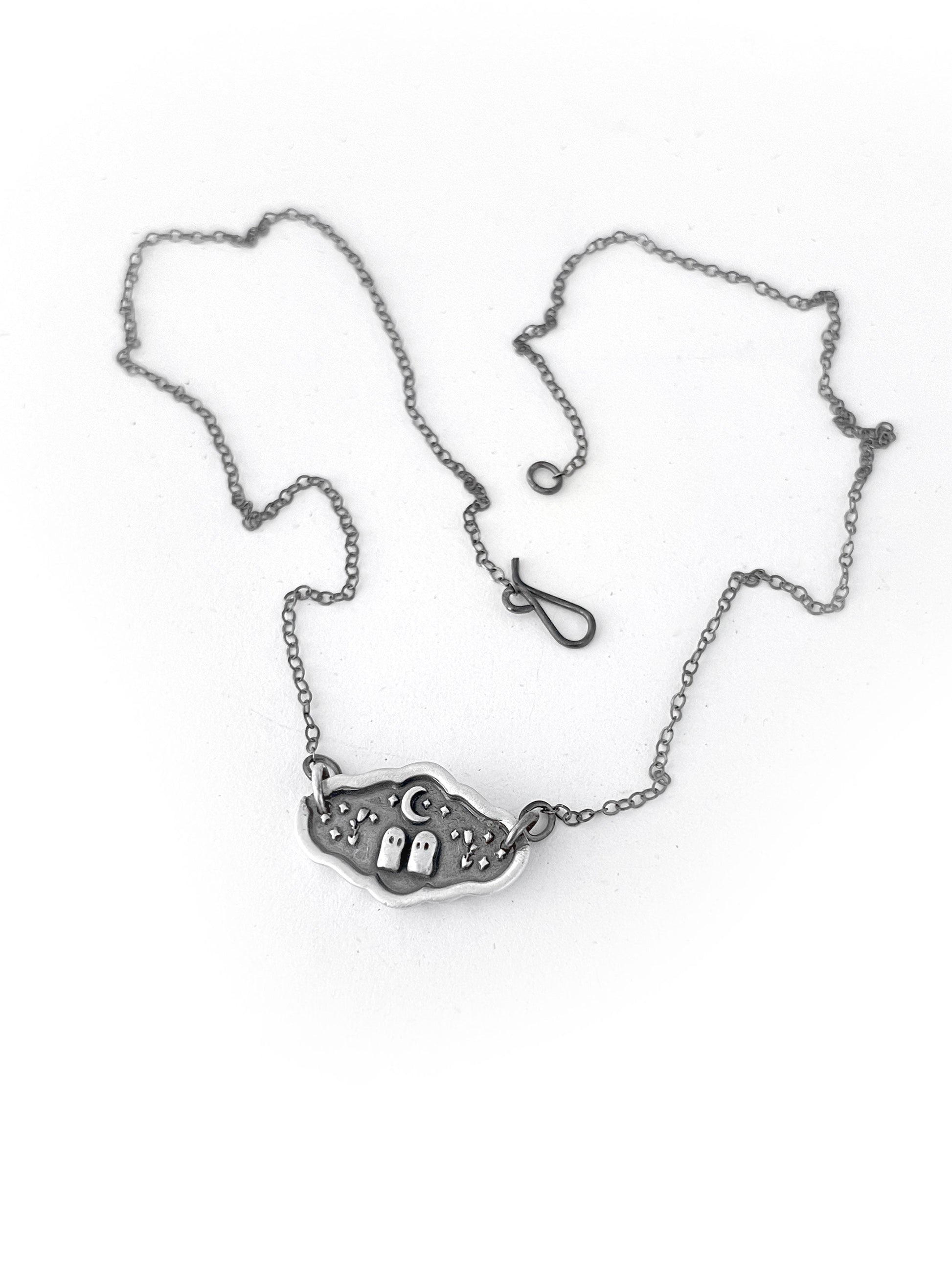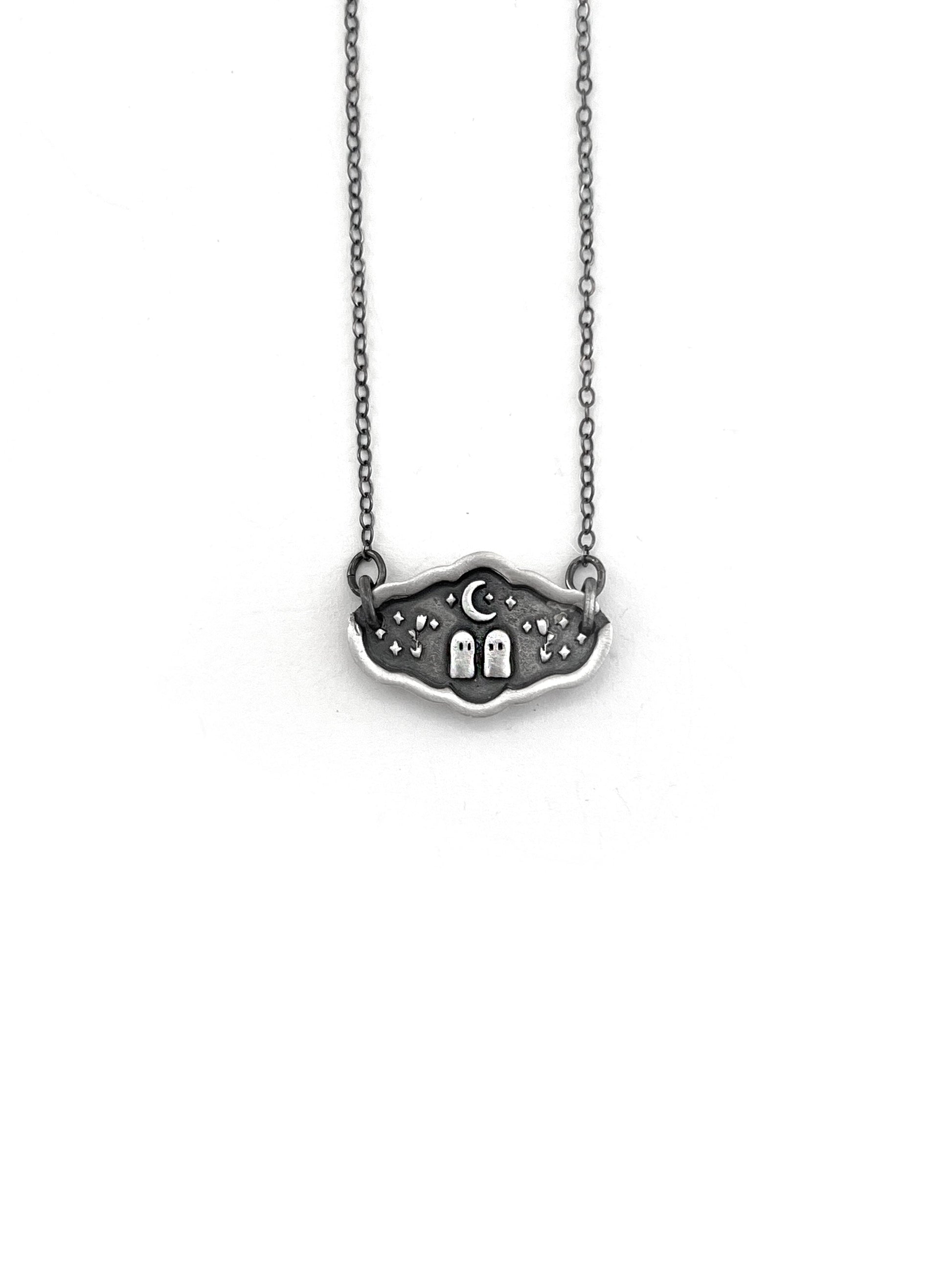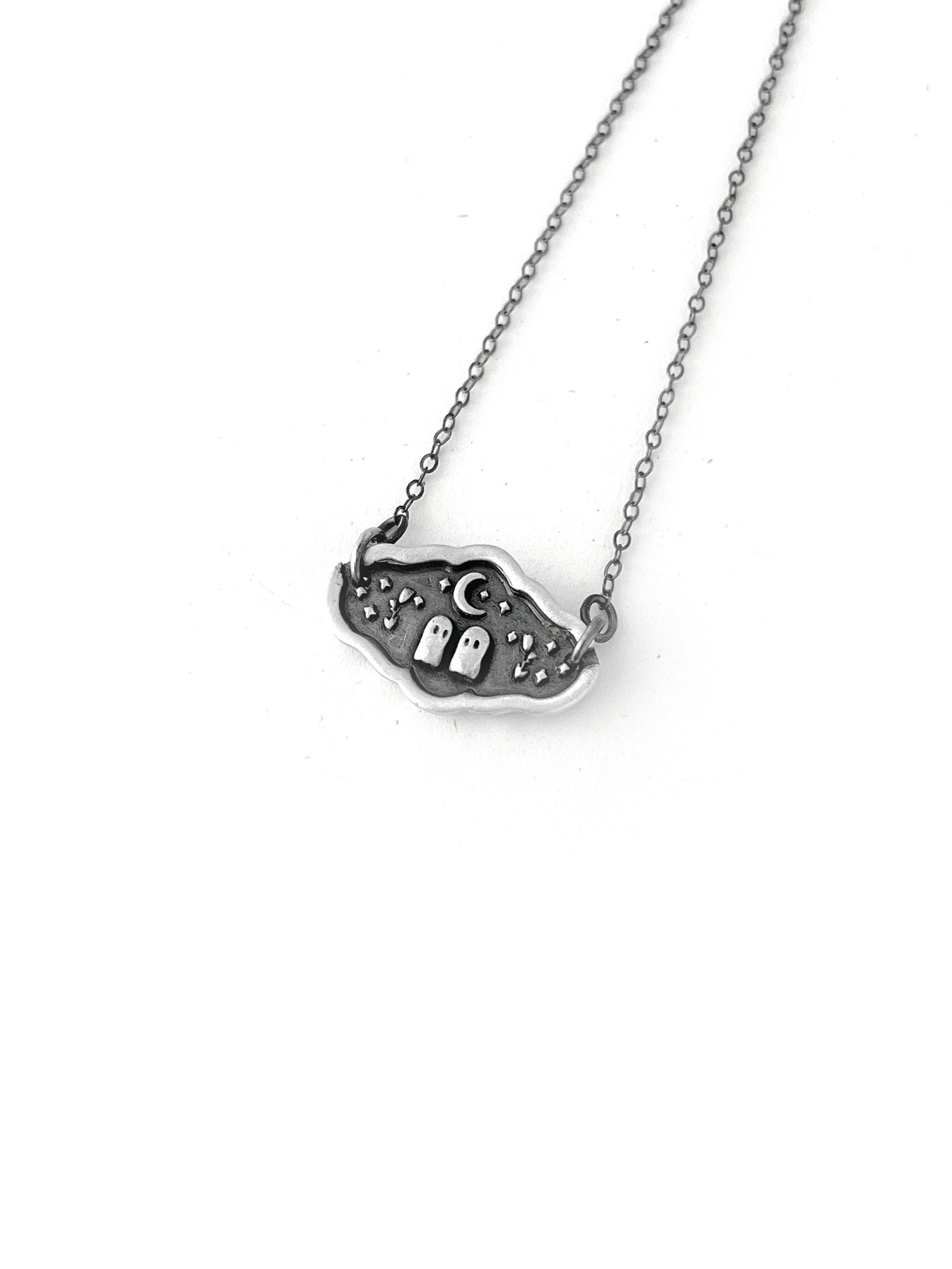 Comes this 100% sterling silver Ghosts in Love necklace, featuring two adorable ghosts under a moonlit sky with twinkling stars.