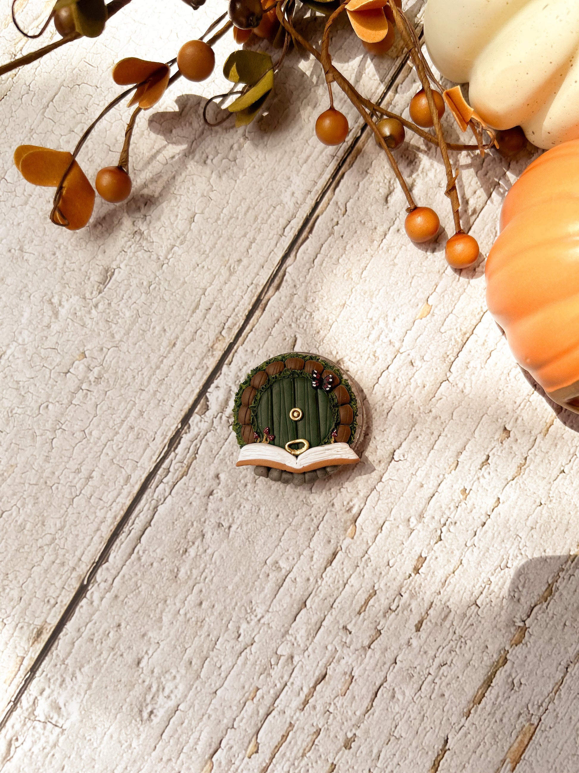 This detailed design features a round green hobbit door framed with tiny bricks, an open book at the bottom, mushrooms, and a sweet little butterfly, all sculpted by hand from polymer clay:)