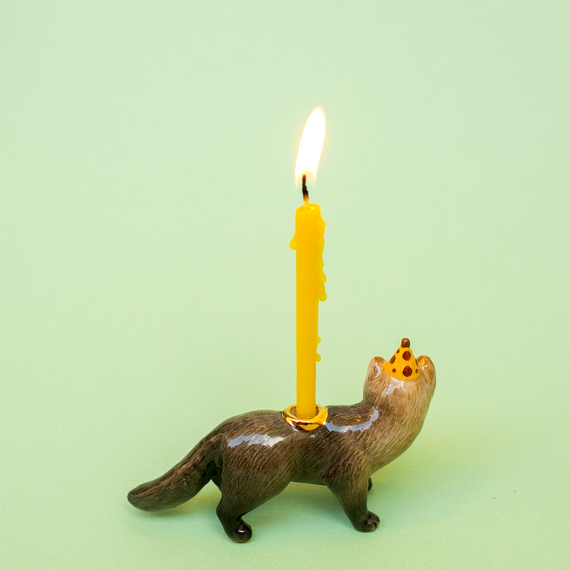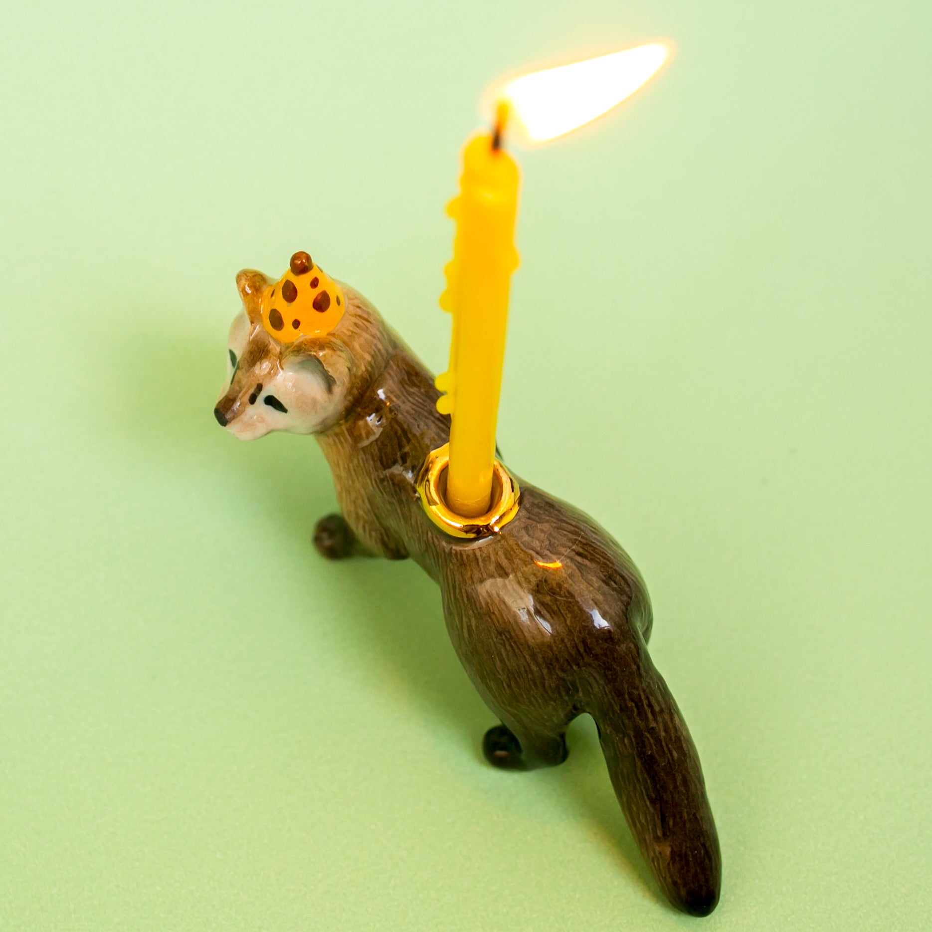NOTES: This delightful Mink Cake Topper features a hand-painted porcelain mink figurine wearing a yellow and burgundy polka dot party hat. A gold luster cup in the middle holds a standard sized birthday candle. This little cutie will add the most delightful feature on top of all sorts of confectionaries for your special occasion!