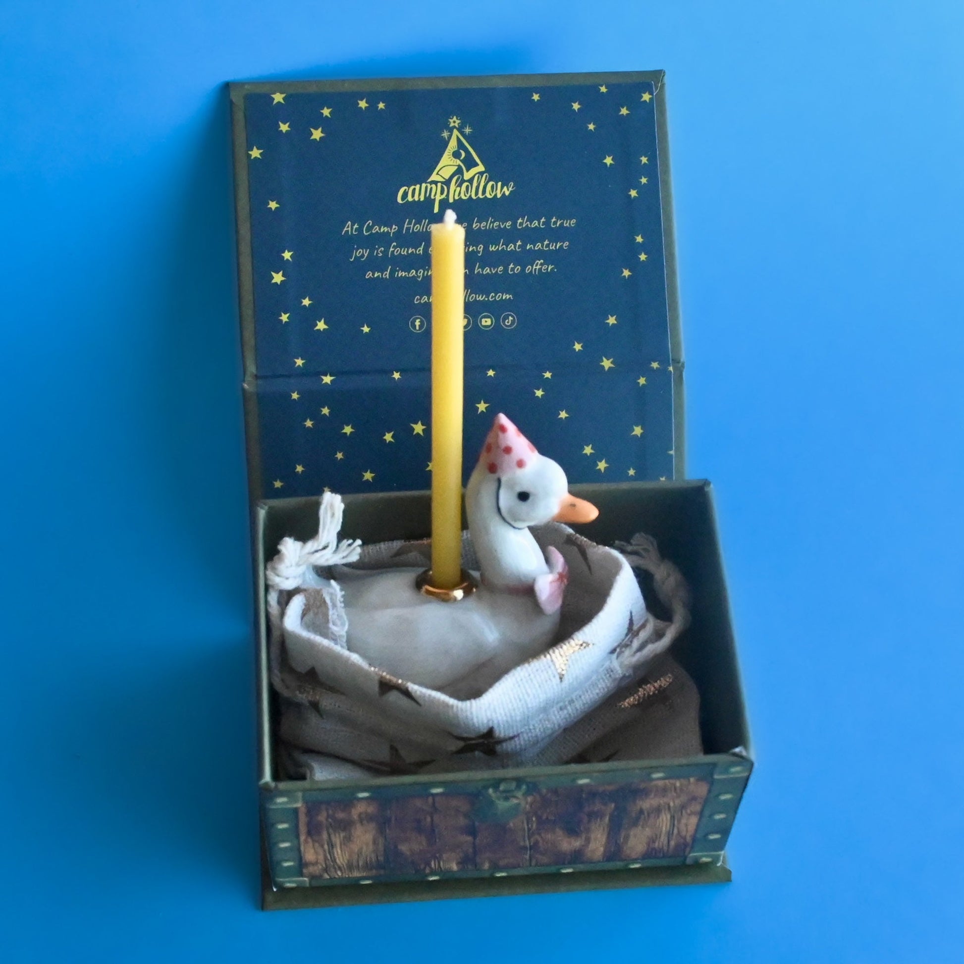 NOTES: The best party guests come dressed to impress, and this charming goose is no different. Clad with a pink bowtie and pink polka dot hat, this new Goose Cake Topper aims to be the belle of the ball at your celebrations. Playfully designed and cheerful in spirit, she is a surefire way to put a smile on anyone's face. When the candle is lit and the warm glow illuminates the figurine's porcelain features, you'll feel transported to a warm and inviting atmosphere where all birthday wishes come true.