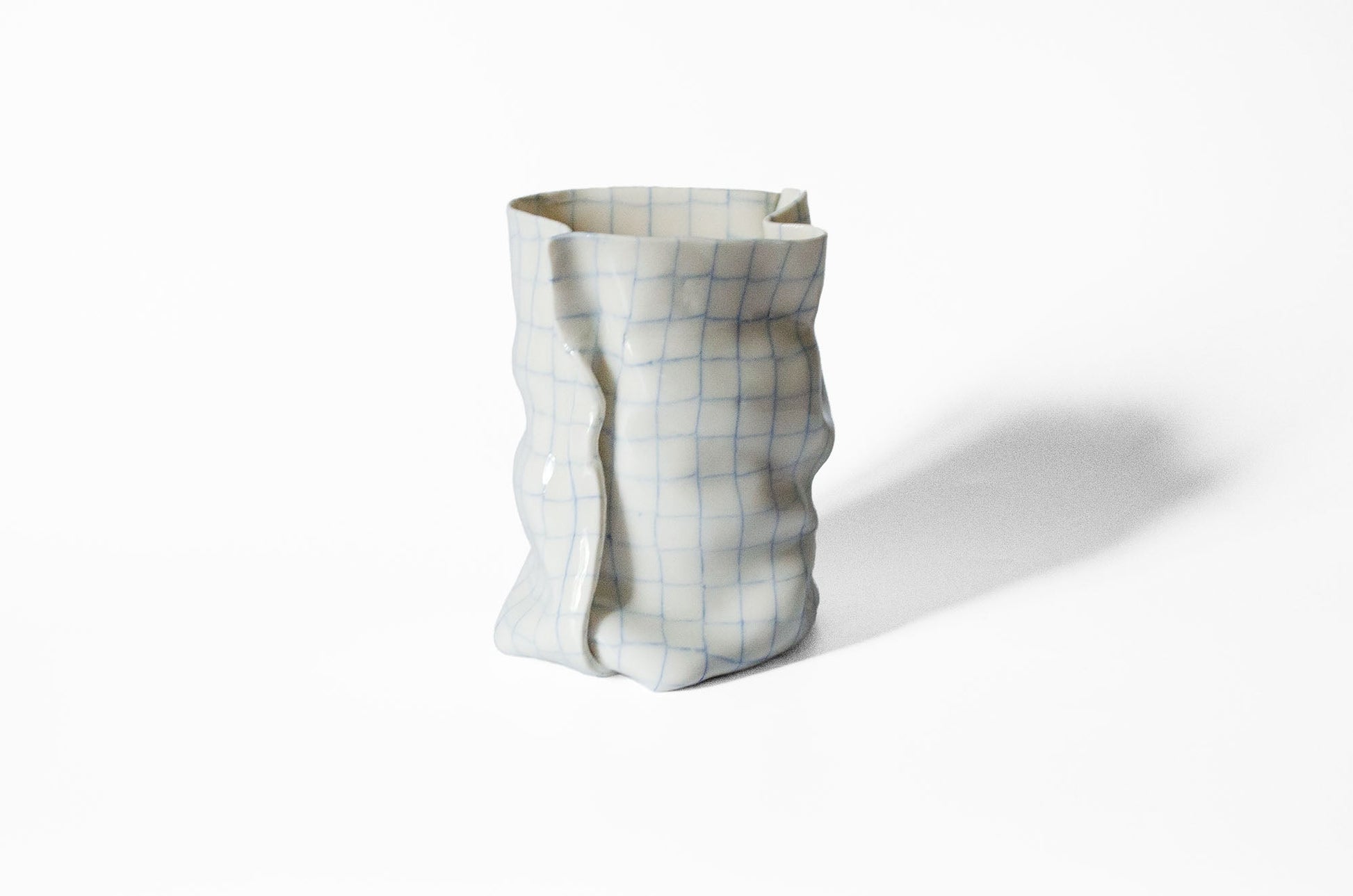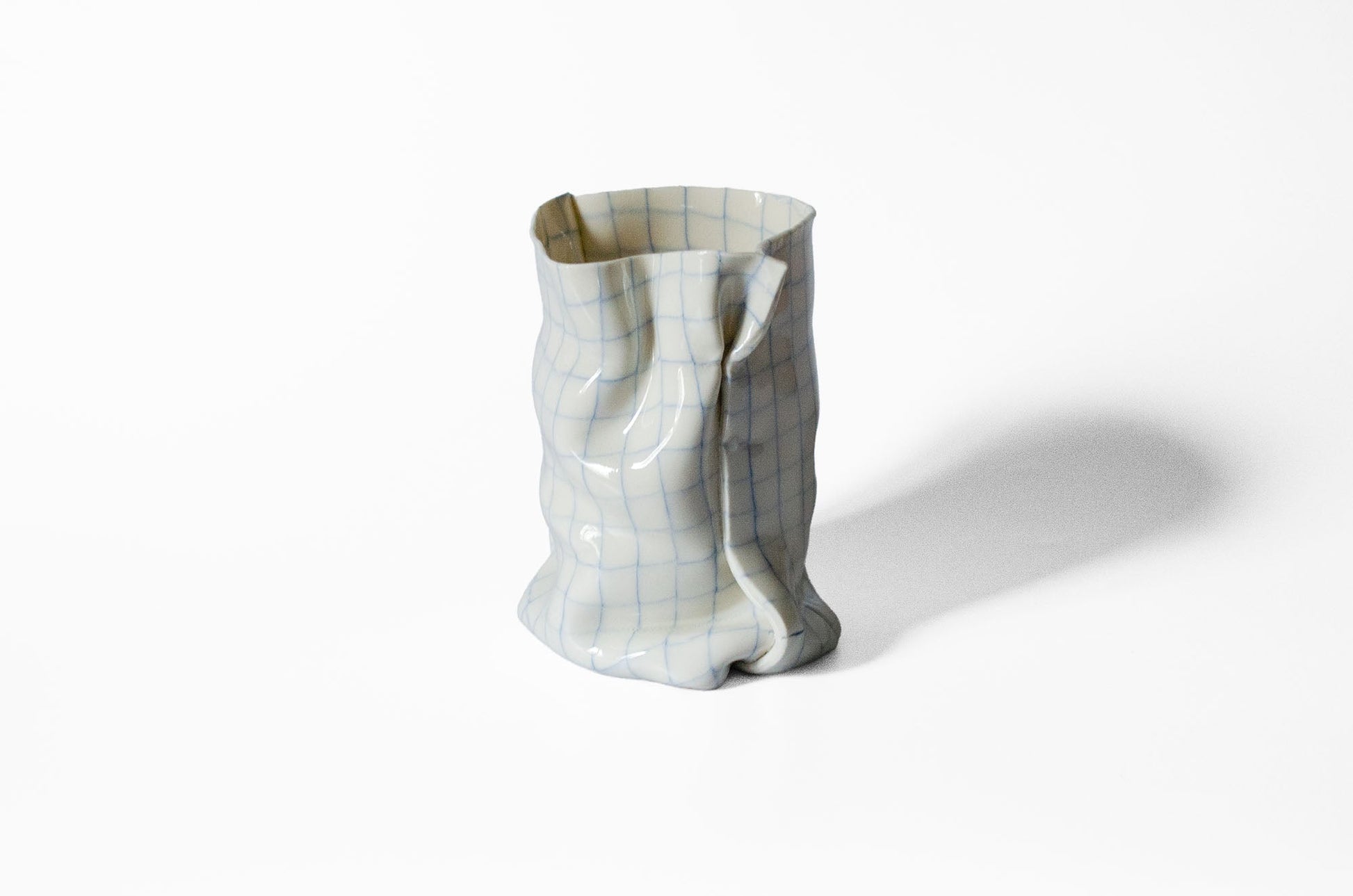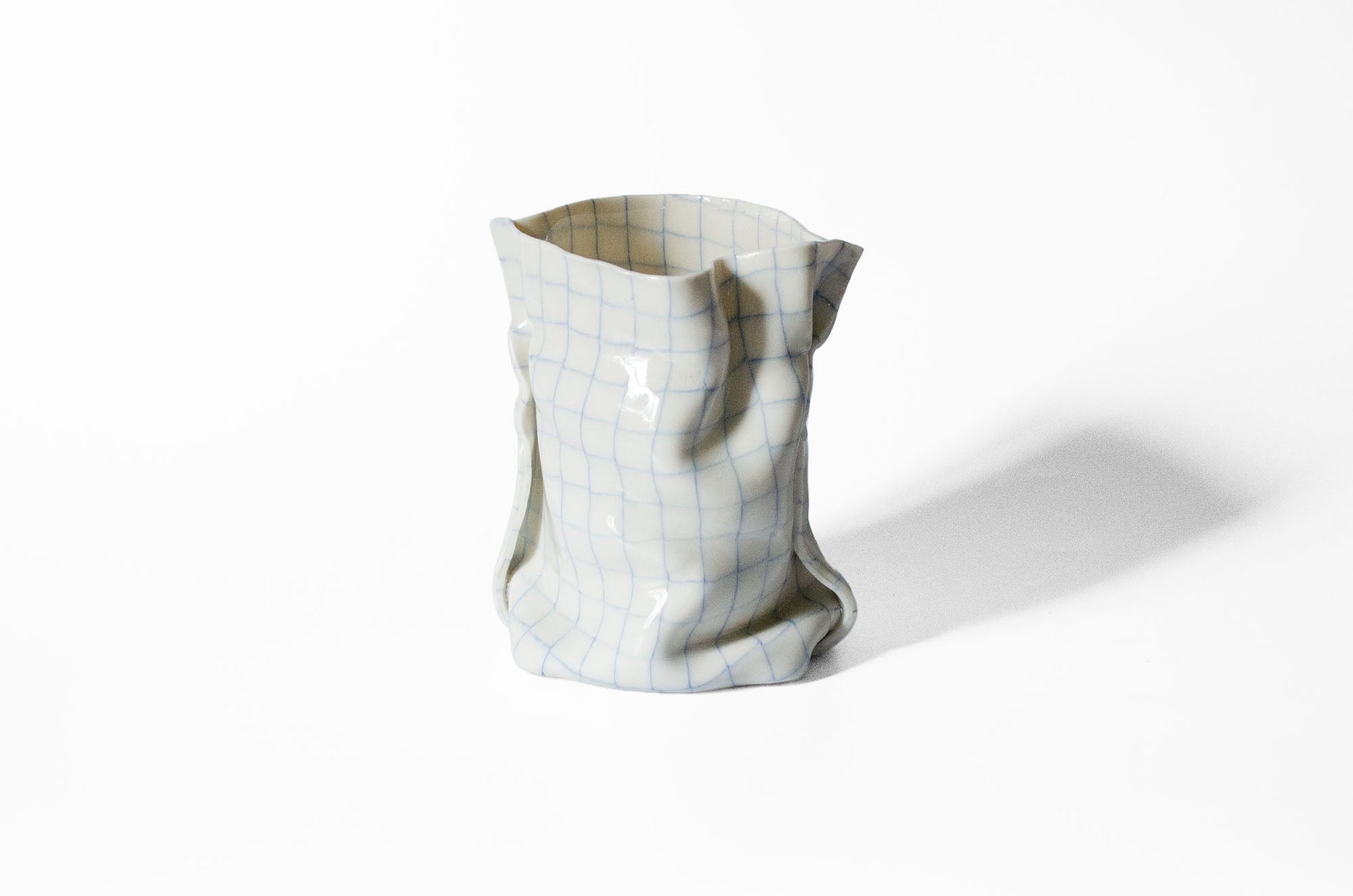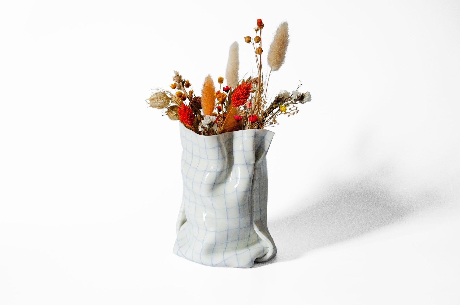 NOTES: How does this porcelain flower vase look so much like a cloth bag? Here's how. Using the Japanese Nerikomi technique, maker Saori M. first inlays a blue checkered pattern, slices it into thin sheets, and assembles it as if actually making a bag piece by piece. The resulting crumpled form gives it a stunning organic softness, making a porcelain piece unlike anything you’ve seen before! With a simple yet very unique design, this piece is gender neutral and suitable for any interior. A small bouquet is a beautiful accompaniment - or use it as a stunning functional piece of art for a vanity (tall make up brushes) or desk (your pens and pencils).